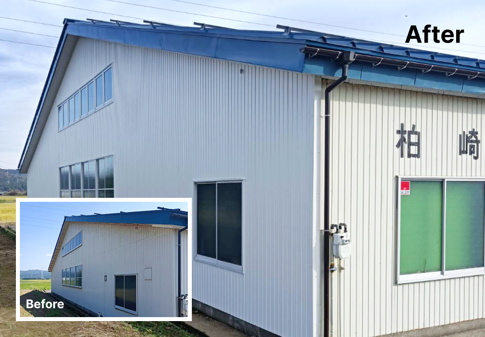 〇塗装工事(ケレン錆止め上塗り) 高圧洗浄/角波外壁、シャッター塗装/シャッター三方枠、庇、鉄骨、軒天塗装