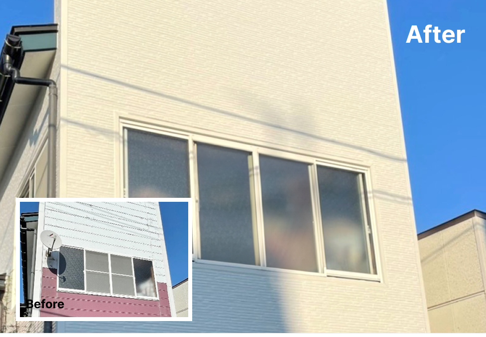 〇外壁カバーリング工事(KMEW金属SD) 木下地/金属サイディング横張り/窓周り板金巻き(カラーSGL0.35ミリ)/シャッター枠板金巻き(カラーSGL0.35ミリ)/シーリング工事/パラペット内角波張り