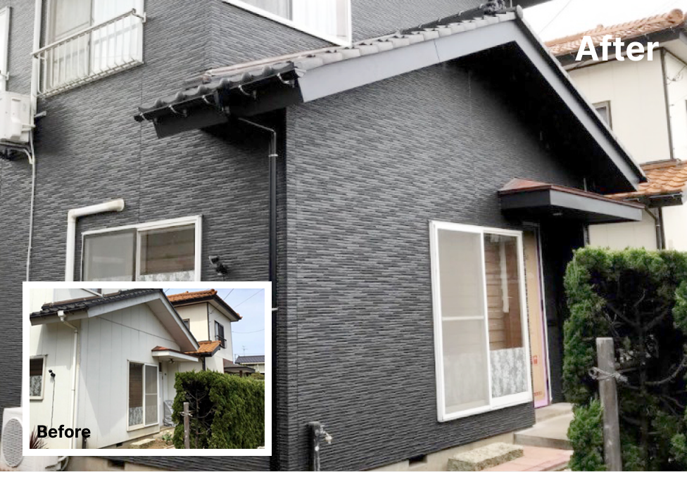 〇外壁張替工事(ニチハ窯業系SD釘留) 既存外壁撤去/透湿防水シート張り/外壁張り/出隅役物加工品取付/シーリング工事/軒天見切り押縁撤去、新規取付/断熱材グラスウール葺き