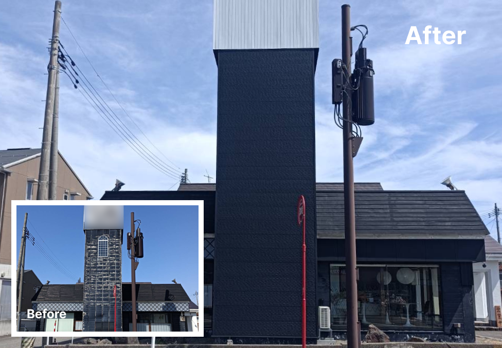 〇外壁カバーリング工事(KMEW金属SD) 軽量鉄骨柱補強/既存外壁押縁撤去/木下地新設/カラーSGL土台水切り加工品取付/金属サイディング横張り/コーキング工事/看板部のみカラーSGL角波張り