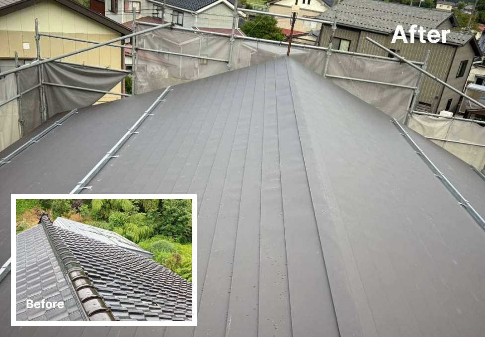〇本屋根葺き替え工事(SGL0.35ミリ) 既存瓦撤去/屋根野地板、屋根吸音材敷き、ルーフィング敷き/カラーSGL新規唐草巻き/屋根葺き替え(AT式横葺き)/ドブ雪止め金具、アングル取付